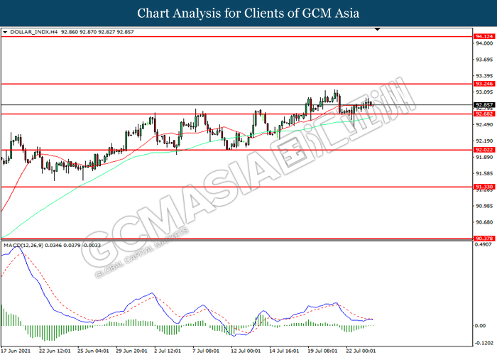 DOLLAR_INDX, H4: Dollar index was traded higher following prior rebound from the support level at 92.70. MACD which illustrated increasing bullish momentum suggest the index to extend its gains toward resistance level at 93.25.