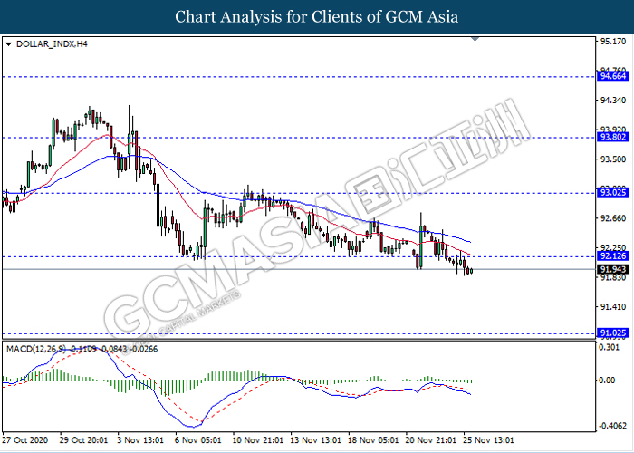 DOLLAR_INDX, H4: Dollar index was traded lower following prior breakout below the previous support level 92.10. MACD which illustrate ongoing bearish momentum signal suggest the dollar to extend its losses towards the support level 91.00.