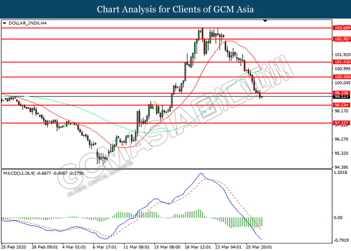 DOLLAR_INDX, H4: Dollar index was traded lower following prior breakout below the previous support level at 99.35. However, MACD which illustrated diminishing bearish momentum suggest the index to be traded higher in short-term as technical correction.