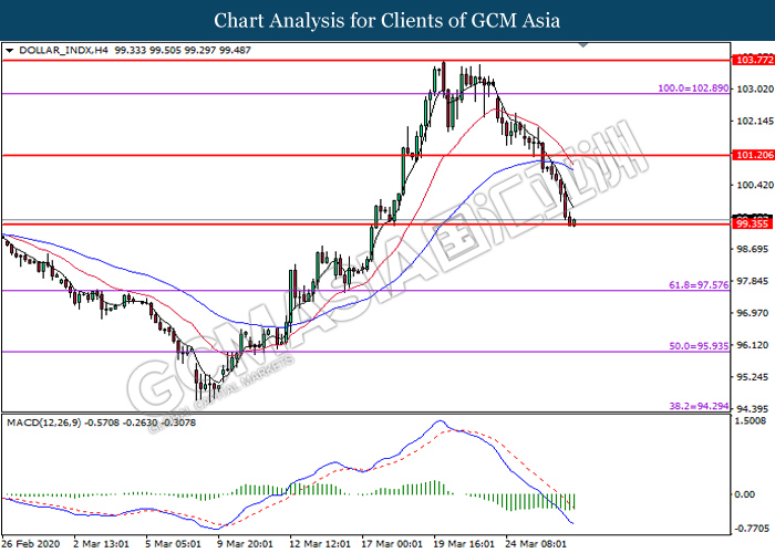 DOLLAR_INDX, H4: Dollar index was traded lower following while currently testing the support level at 99.35. MACD which illustrate bearish bias momentum suggest the dollar to extend its losses after it successfully breakout below the support level at 99.35.