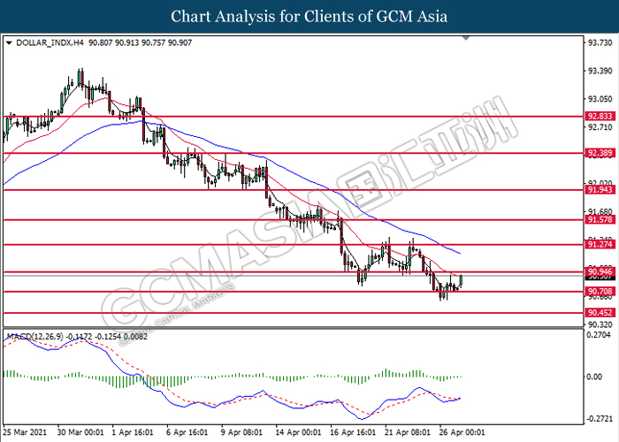 DOLLAR_INDX, H4: Dollar index was traded higher while currently testing the resistance level at 90.95. MACD which illustrated diminishing bearish momentum suggest the index to extend its gains after it successfully breakout above the resistance level.