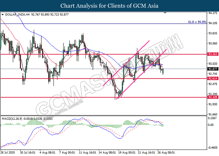 DOLLAR_INDX, H4: Dollar index was traded lower following prior breakout below the channel’s bottom level. MACD which illustrate bearish momentum signal suggest the dollar to extend its losses toward the support level at 92.60.