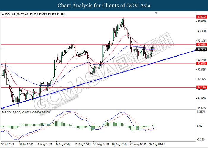 DOLLAR_INDX, H4: Dollar index was traded higher while currently testing near the resistance level 93.10. MACD which illustrate bullish momentum signal with the formation of golden cross suggest the dollar to extend its gains after it breaks above the resistance level 93.10.
