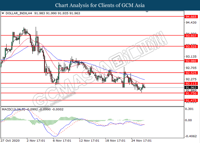 DOLLAR_INDX, H4: Dollar index was traded lower following prior retracement from the resistance level at 92.10. However, MACD which illustrate diminishing bearish momentum suggest the dollar to undergo technical rebound in short term.