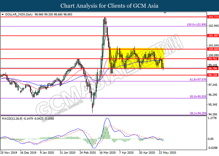 DOLLAR_INDX, Daily: Dollar index was traded lower while currently testing the support level at 98.80. MACD which illustrate bearish bias momentum suggest the pair to extend its losses after it successfully breakout below the support level at 98.80.