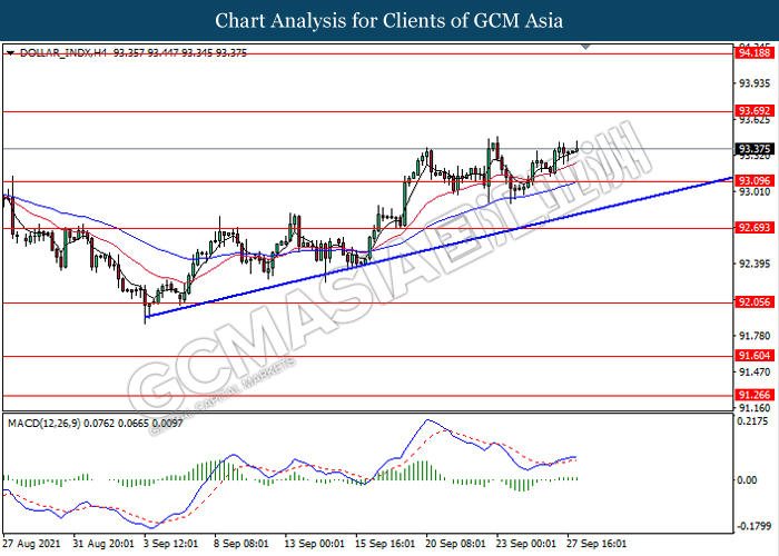 DOLLAR_INDX, H4: Dollar index was traded higher following recent rebound from the support level 93.10. MACD which illustrate bullish momentum signals suggest the dollar to extend its gains towards the resistance level 93.70.