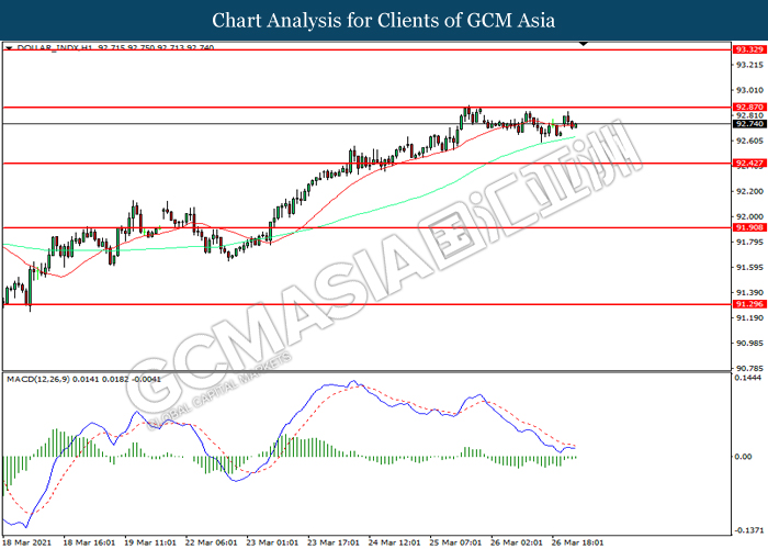 DOLLAR_INDX, H1: Dollar index was traded within a range while currently testing the resistance level at 92.85. MACD which illustrated diminishing bearish momentum suggest the index to be traded higher after it successfully breakout above the resistance level.