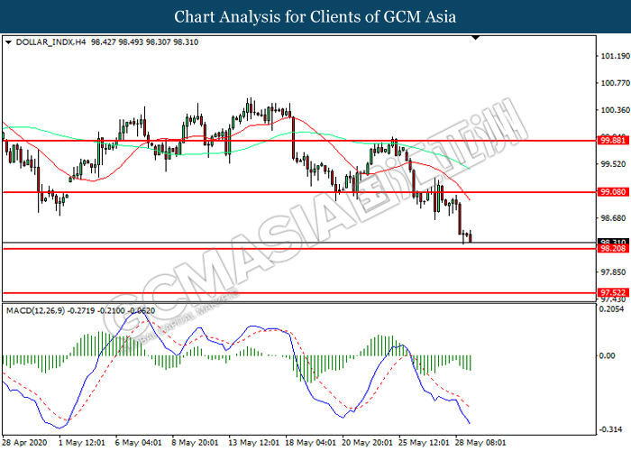 DOLLAR_INDX, H4: Dollar index was traded lower while currently testing the support level at 98.20. MACD which illustrated increasing bearish momentum suggest the index to extend its losses after it successfully breakout below the support level.