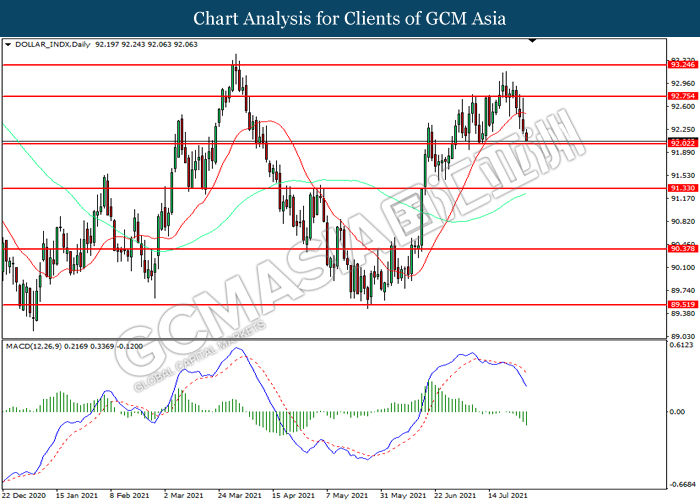 DOLLAR_INDX, Daily: Dollar index was traded lower while currently testing the support level at 92.00. MACD which illustrated increasing bearish momentum suggest the index to extend its losses after it successfully breakout below the support level.
