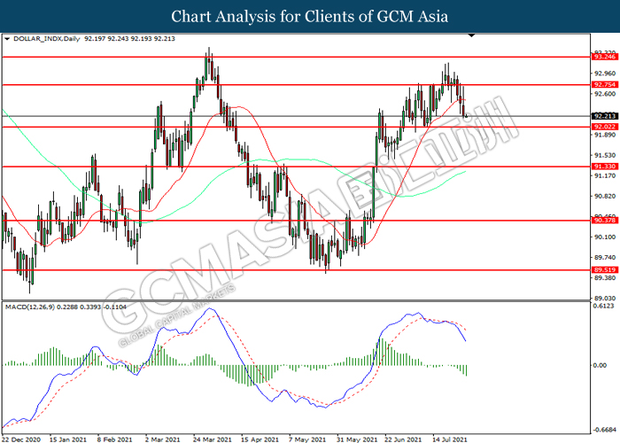 DOLLAR_INDX, Daily: Dollar index was traded lower following prior breakout below the previous support level at 92.75. MACD which illustrated increasing bearish momentum suggest the index to extend its losses toward support level at 92.00.