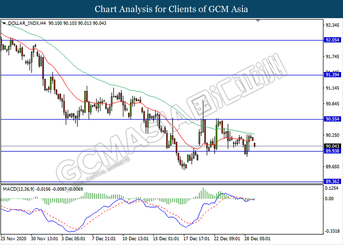 DOLLAR_INDX, H4: Dollar index was traded lower while currently testing near the support level 89.95. MACD which illustrate bearish bias signal suggest the dollar to extend its losses after it breaks below the support level.