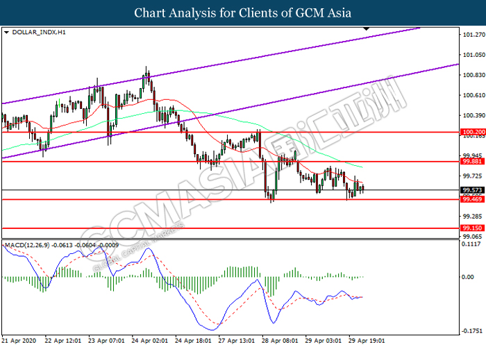 DOLLAR_INDX, H1: Dollar index was traded lower while currently near the support level at 99.45. However, MACD which illustrated diminishing bearish momentum suggest the index to be traded higher in short-term as technical correction.