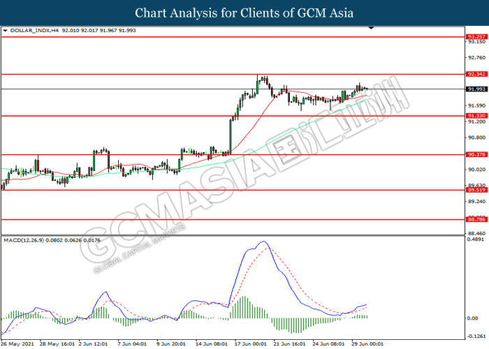 DOLLAR_INDX, H4: Dollar index was traded higher while currently near the resistance level at 92.35. MACD which illustrated increasing bullish momentum suggest the index to extend its gains after it successfully breakout above the resistance level.