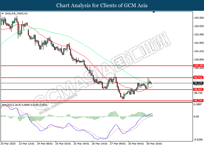 DOLLAR_INDX, H1: Dollar index was traded lower following prior retracement from the resistance level at 99.70. MACD which illustrated diminishing bullish momentum suggest the index to extend its losses toward support level at 98.95.