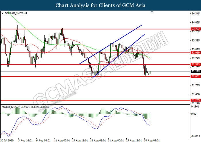 DOLLAR_INDX, H4: Dollar index was traded lower while currently testing the support level at 92.10. MACD which illustrated diminishing bearish momentum suggest the index to be traded higher in short-term as technical correction.