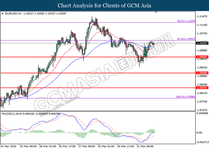 EURUSD, H1: EURUSD was traded lower following prior retracement from the resistance level at 1.1040, MACD which illustrate diminishing bullish momentum suggests the pair to be traded lower in short term toward the support level at 1.0970.
