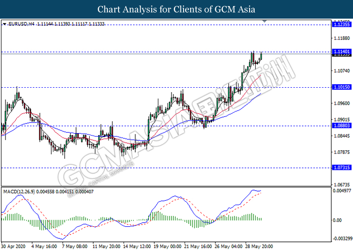 EURUSD, H4: EURUSD was traded higher while currently testing the resistance level 1.1140. However, MACD which illustrate diminishing bullish momentum suggest the pair to experience a technical correction in short term towards the support level 1.1015