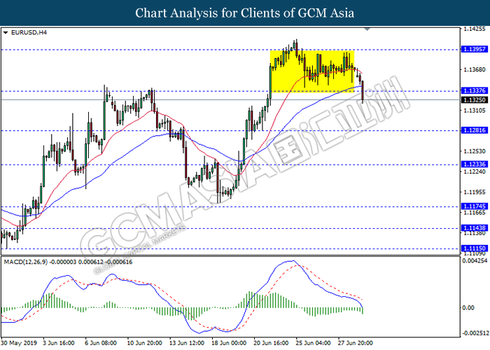 EURUSD, H4: EURUSD was traded lower following prior breakout below the previous support level 1.1335. MACD which illustrate persistent bearish momentum suggest the pair to extend its losses towards the support level 1.1280.