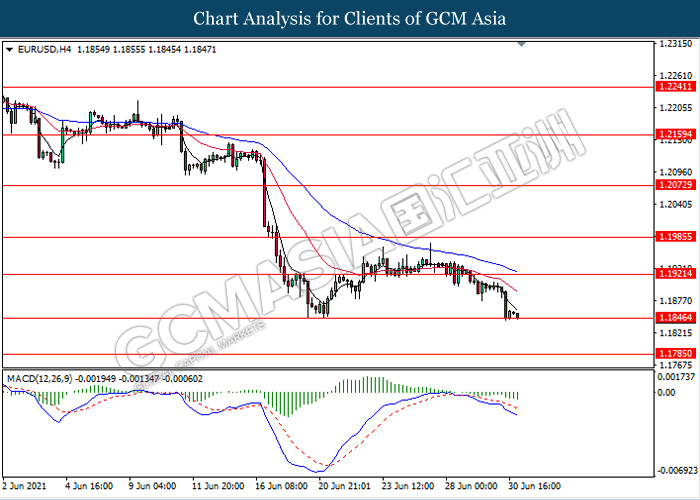EURUSD, H4: EURUSD was traded lower while currently testing the support level 1.1845. MACD which illustrate bearish momentum signal suggest the pair to extend its losses after it breaks below the support level 1.1845.