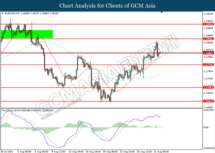 EURUSD, H4: EURUSD was traded lower while currently testing the support level at 1.1805. MACD which illustrated increasing bearish momentum suggest the pair to extend its losses after it successfully breakout below the support level.
