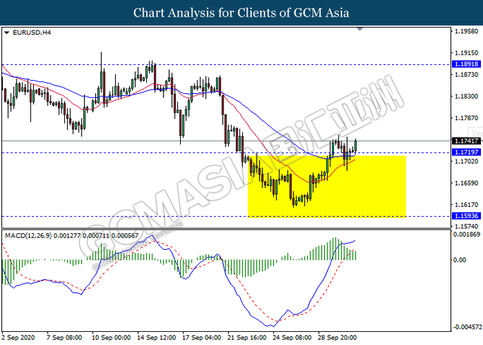 EURUSD, H4: EURUSD was traded higher following prior rebound from the support level 1.1720. MACD which illustrate bullish bias signal suggest the pair to extend its rebound towards the resistance level 1.1890.
