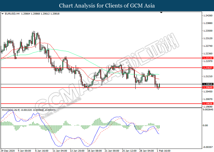 EURUSD, H4: EURUSD was traded lower while currently testing the support level at 1.2065. However, MACD which illustrated diminishing bearish momentum suggest the pair to be traded higher in short-term as technical correction.