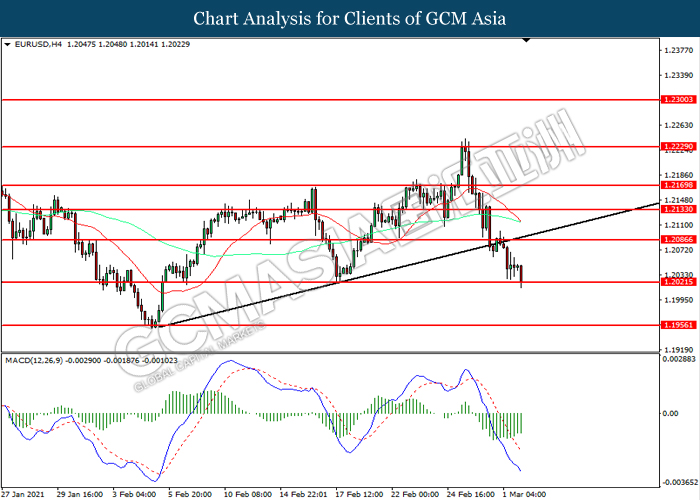 EURUSD, H4: EURUSD was traded lower while currently testing the support level at 1.2020. However, MACD which illustrated diminishing bearish momentum suggest the pair to be traded higher in short-term as technical correction.