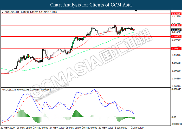 EURUSD, H1: EURUSD was traded within a range while currently near the resistance level at 1.1150. MACD which illustrated increasing bearish momentum suggest the pair to extend its losses toward support level at 1.1090.