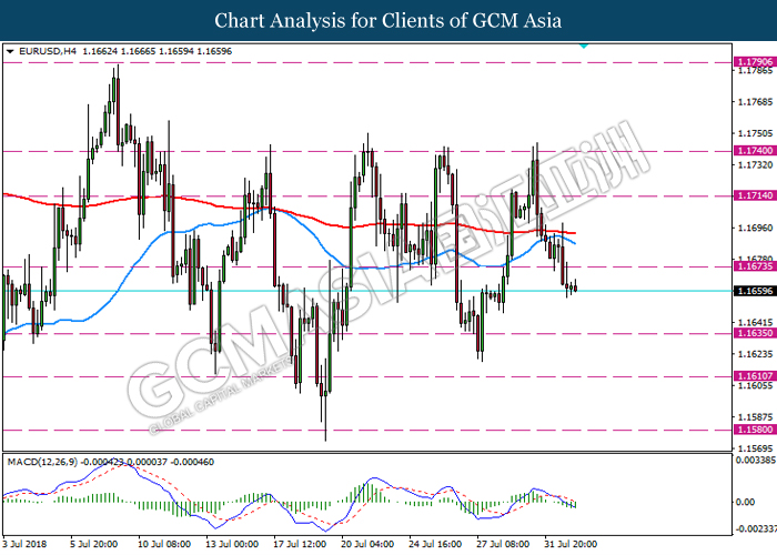 EURUSD, H4: EURUSD was traded lower following prior breakout below the support level 1.1675. MACD which display ongoing bullish momentum with death cross formation suggest the pair extend its losses towards the support level 1.1635.