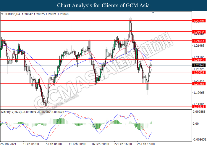 EURUSD, H4: EURUSD was traded higher following prior breakout above the previous resistance level at 1.2065. MACD which illustrated bullish bias momentum suggest the pair to extend its gains toward the resistance level at 1.2105.