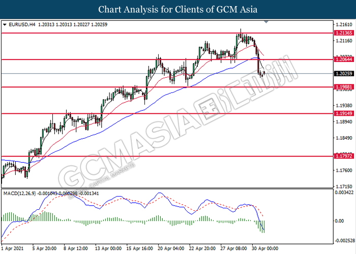 EURUSD, H4: EURUSD was traded lower following prior breakout below the previous support level at 1.2065. MACD which illustrated bearish bias momentum signal suggest the pair to extend its losses toward the support level at 1.1990.