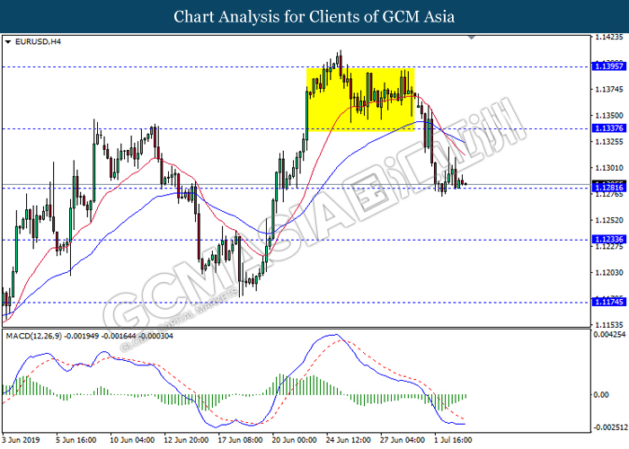 EURUSD, H4: EURUSD was traded lower while currently testing the support level 1.1280. However, MACD which illustrate bullish bias signal suggest the pair to be traded higher towards the resistance level 1.1335.