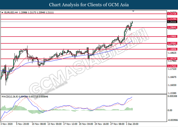 EURUSD, H4: EURUSD was traded higher following prior breakout above the previous resistance level at 1.2065. MACD which illustrate bullish bias momentum signal suggest the pair to extend its gains toward the resistance level at 1.2130.