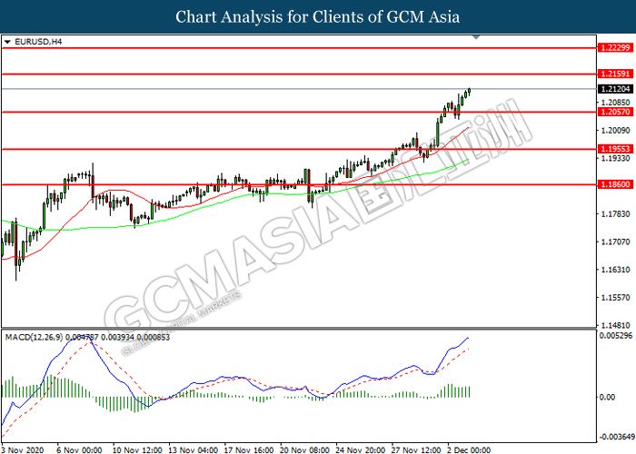 EURUSD, H4: EURUSD was traded higher following prior breakout above the previous resistance level at 1.2055. MACD which illustrated increasing bullish momentum suggest the pair to extend its gains toward resistance level at 1.2160.