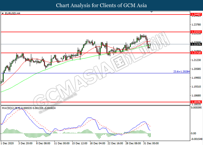 EURUSD, H4: EURUSD was traded lower following prior retracement from the resistance level at 1.2325. However, MACD which illustrated diminishing bearish momentum suggest the pair to be traded higher in short-term as technical correction.