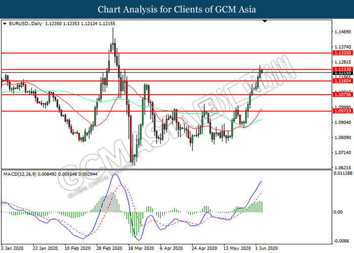 EURUSD, Daily: EURUSD was traded higher while currently testing the resistance level 1.1235. However, MACD which illustrated diminishing bullish momentum suggest the pair to be traded lower in short-term as technical correction.