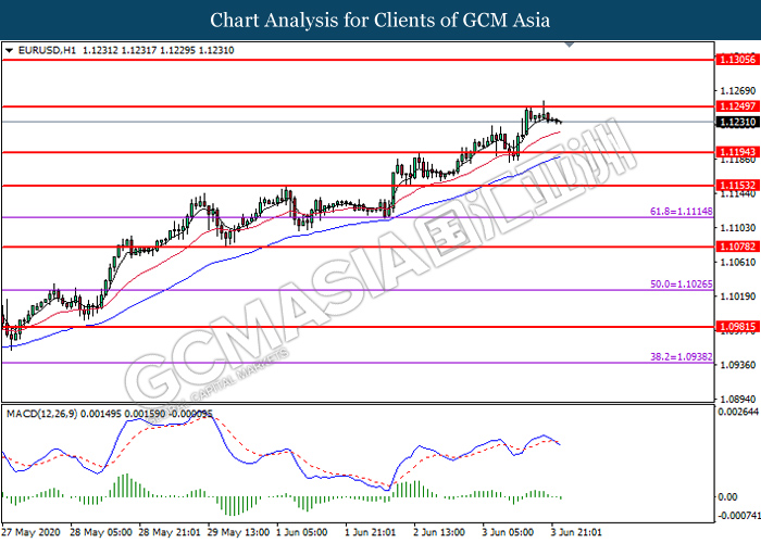 EURUSD, H1: EURUSD was traded lower following prior retracement from the resistance level at 1.1250. MACD which illustrate bearish bias momentum signal suggest the pair to extend its losses toward the support level at 1.1195.