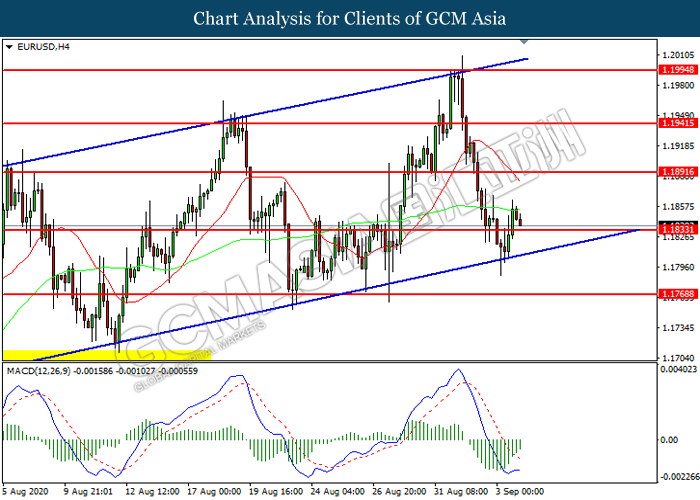 EURUSD, H4: EURUSD was traded lower while currently testing the support level at 1.1835. However, MACD which illustrated diminishing bearish momentum suggest the pair to be traded higher in short-term as technical correction.