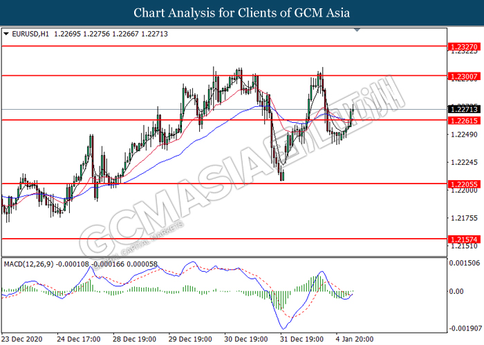EURUSD, H1: EURUSD was traded higher following prior breakout above the previous resistance level at 1.2260. MACD which illustrated diminishing bearish momentum suggest the pair to be traded higher toward the resistance level at 1.2300.