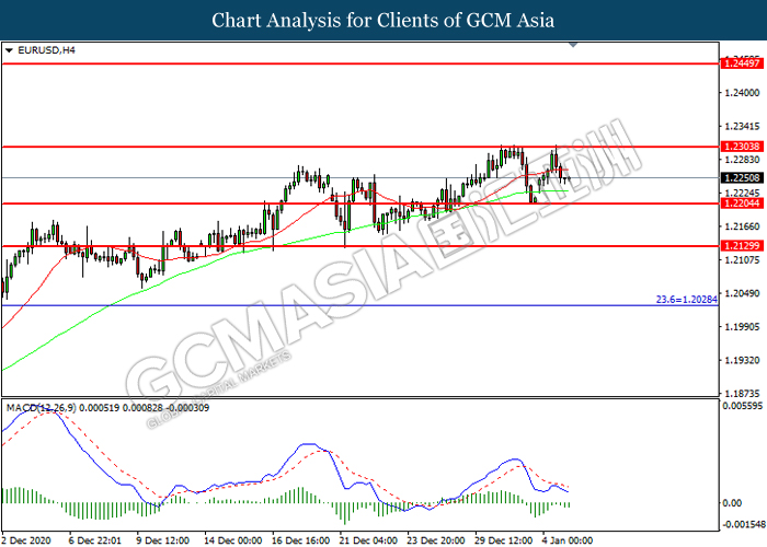 EURUSD, H4: EURUSD was traded lower following prior retracement from the resistance level at 1.2305. However, MACD which illustrated diminishing bearish momentum suggest the pair to be traded higher in short-term as technical correction.