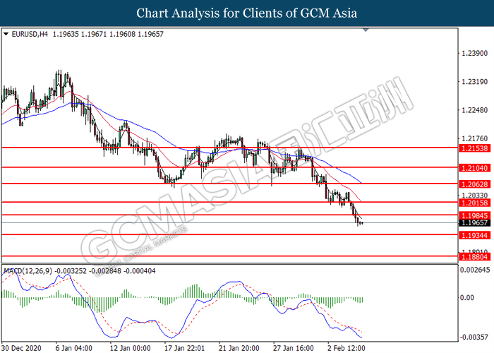 EURUSD, H4: EURUSD was traded lower following prior breakout below the previous support level at 1.1985. MACD which illustrated bearish bias momentum suggest the pair to extend its losses toward the support level at 1.1935.