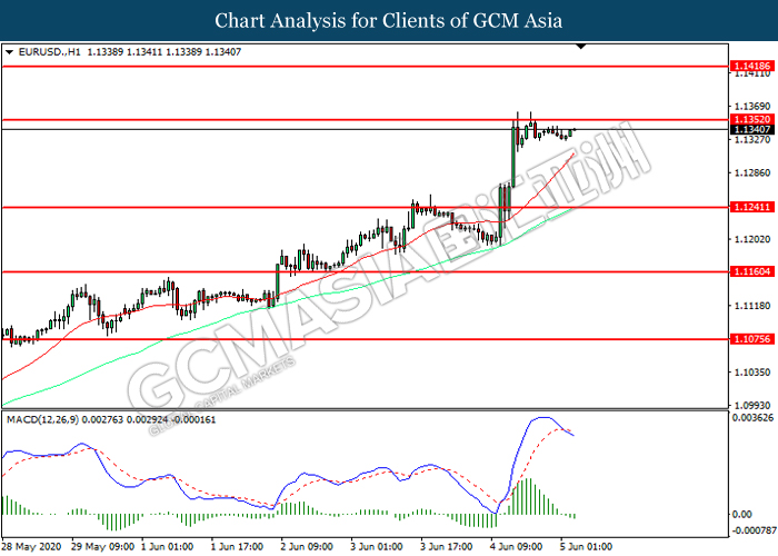 EURUSD, H1: EURUSD was traded higher while currently testing the resistance level at 1.1350. However, MACD which illustrated increasing bearish momentum suggest the pair to be traded lower in short-term as technical correction.