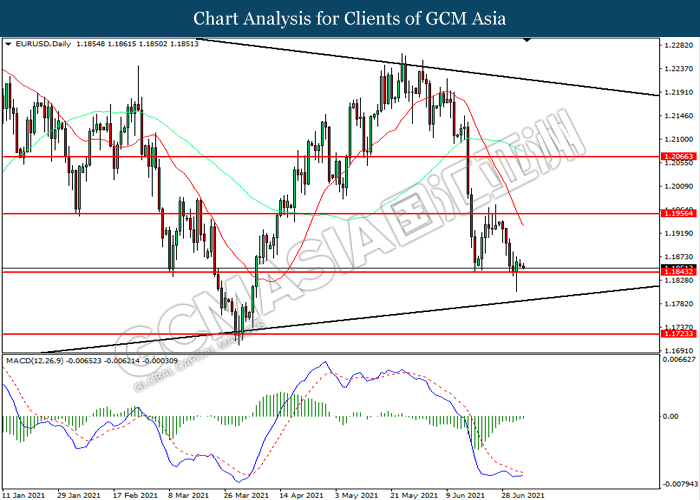 EURUSD, Daily: EURUSD was traded lower while currently near the support level at 1.1845. However, MACD which illustrated bearish momentum suggest the pair to be traded higher in short-term as technical correction.