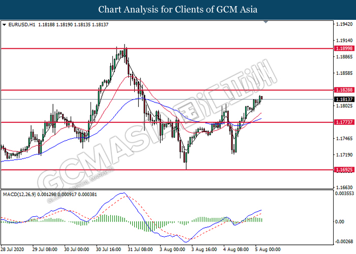EURUSD, H1: EURUSD was traded higher following prior breakout above the previous resistance level at 1.1775. MACD which illustrate bullish bias momentum suggest the pair to extend its gains toward the resistance level at 1.1830.