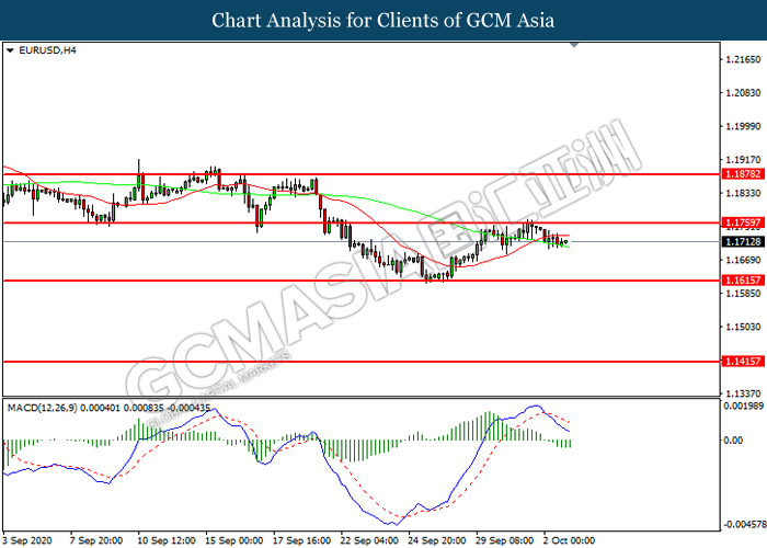 EURUSD, H4: EURUSD was traded lower following prior retracement from the resistance level at 1.1760. MACD which illustrated increasing bearish momentum suggest the pair to extend its losses toward support level at 1.1615.