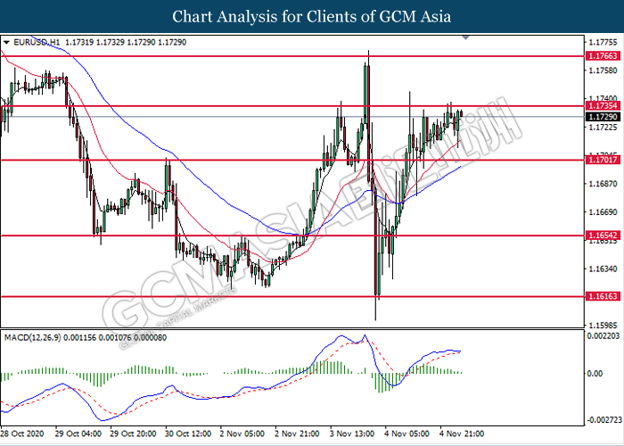 EURUSD, H4: EURUSD was traded higher while currently testing near the resistance level 1.1735. However, MACD which illustrate diminishing bullish momentum signal suggest the pair to undergo technical correction toward lower level.