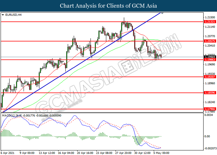 EURUSD, H4: EURUSD was traded lower while currently testing the support level at 1.1985. However, MACD which illustrated diminishing bearish momentum suggest the pair to be traded higher in short-term as technical correction.
