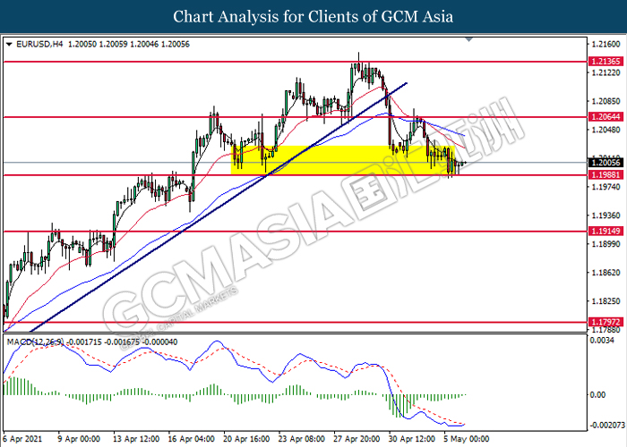 EURUSD, H4: EURUSD was traded lower while currently testing the support level at 1.1990. However, MACD which illustrated diminishing bearish momentum signal suggest the pair to undergo technical correction in short term.