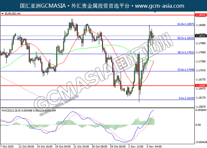 EURUSD, H4: EURUSD was traded lower while currently testing the support level at 1.1810. MACD which illustrated diminishing bullish momentum suggest the pair to extend its losses after it successfully breakout below the support level.