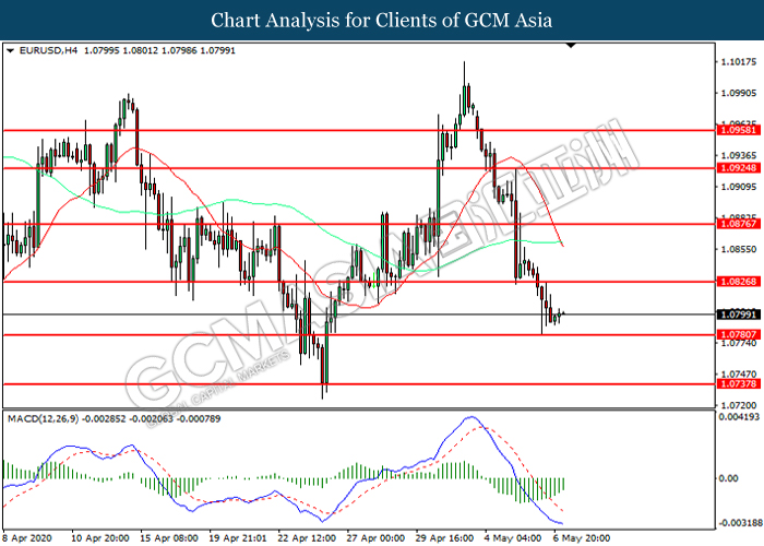 EURUSD, H4: EURUSD was traded lower while currently near the support level at 1.0780. However, MACD which illustrated diminishing bearish momentum suggest the pair to be traded higher in short-term as technical correction.